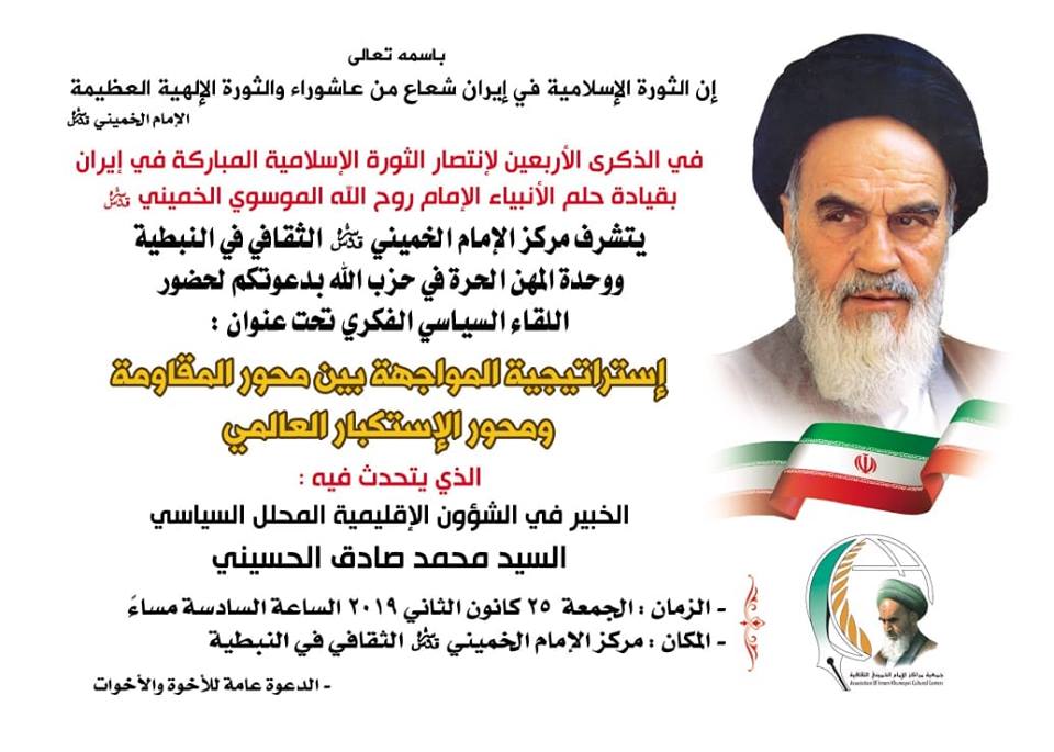 يتشرف مركز الإمام الخميني قدس سره الثقافي في النبطية ووحدة المهن الحرة في حزب الله بدعوتكم لحضور اللقاء السياسي الفكري تحت عنوان: